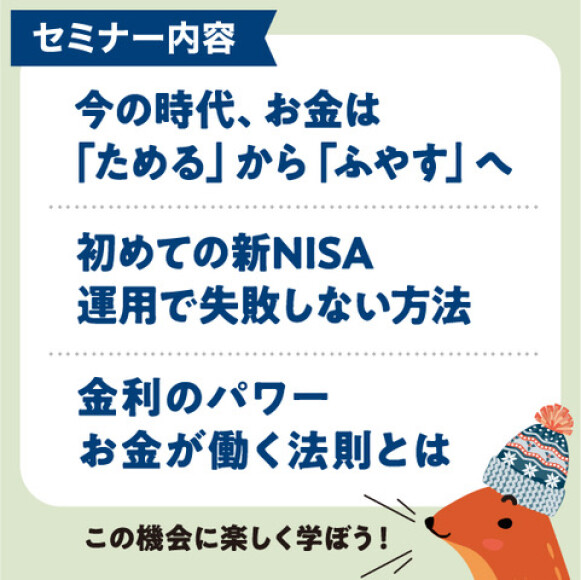 ”今さら聞けない新NISA”を中心に、初めての方にもわかりやすく解説します。楽しみながら学べますので、お気軽にご参加ください。