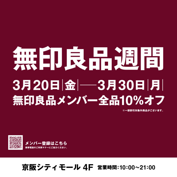 「無印良品週間」は、無印良品メンバーを対象に、全品(※一部商品除く)10%オフとなるキャンペーンです。いつもご愛顧いただいているお客さまに感謝の気持ちを込めて、開催を決定!